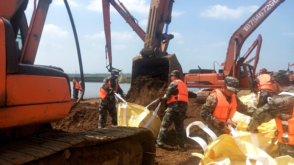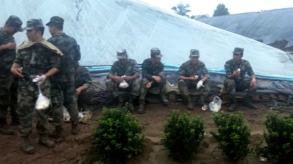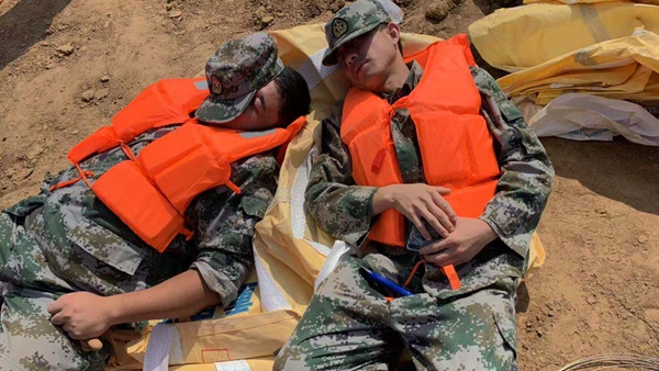 8月15日,孚日集團(tuán)民兵分隊(duì)搭乘沖鋒舟,前往張僧河?xùn)|岸裝填沙袋,參與完成最后的決堤合攏任務(wù)。挖掘機(jī)等大型機(jī)械投入救災(zāi),民兵們的號(hào)子聲、腳步聲和機(jī)械作業(yè)聲交織,大家意志堅(jiān)定為同一個(gè)目標(biāo)拼搏,終于將肆虐的洪水?dāng)r在了河道之內(nèi)。至此,民兵們已經(jīng)好幾天沒(méi)見過(guò)床了——累了,他們就地休息,餓了,他們匆忙進(jìn)食。